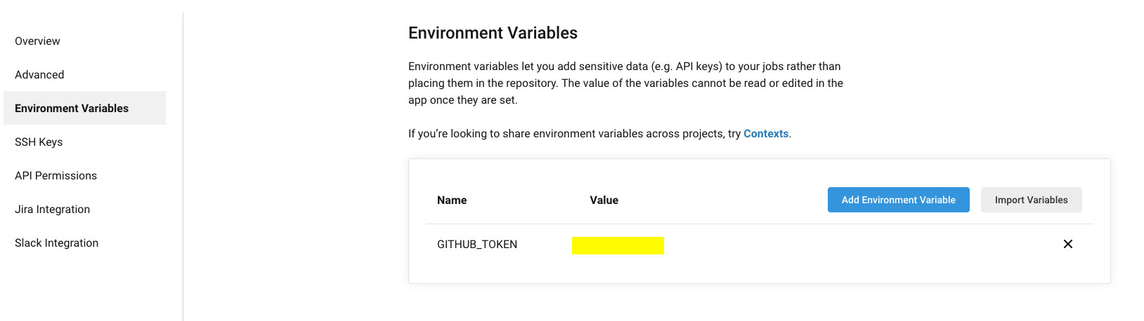 On the left, click on the Environment Variables tab and add a custom Environment Variable, GITHUB_TOKEN, which contains the value of your GitHub Personal Access Token.