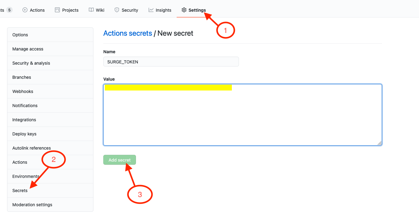 In the repo of your MarkBind site, create a new secret by going to "Settings"->"Secrets" and naming it as SURGE_TOKEN and setting its value to the value of the generated surge token.